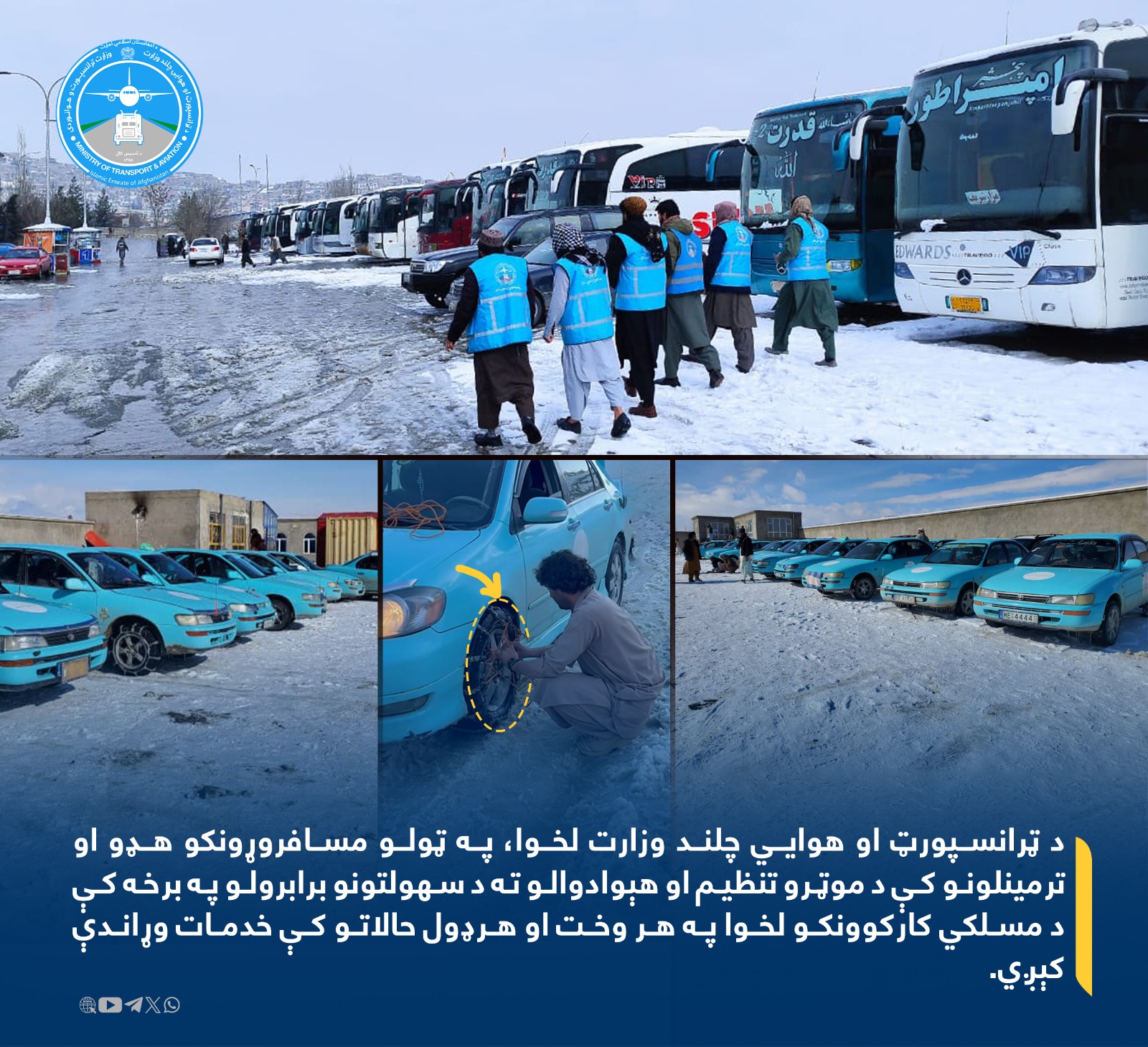 د ټرانسپورټ او هوایي چلند وزارت لخوا په ټولو مسافروړونکو هډو او ترمينلونو کې د موټرو تنظیم او هېوادوالو ته د سهولتونو برابرولو په برخه کې د مسلکي کارکوونکو لخوا په هر وخت او هر ډول حالاتو کې خدمات وړاندې كېږي.